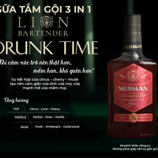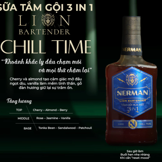 Nerman Lion Bartender là tuyên ngôn cho “chất men mới”. Một dòng sản phẩm 3in1 tiện lợi, hiệu quả, kết hợp mùi hương nước hoa cao cấp cùng thiết kế đậm tinh thần bar whisky, tạo nên một trải nghiệm grooming thời thượng. Với Nerman Lion Bartender, mỗi buổi sáng của người đàn ông bắt đầu bằng “nghi thức pha chế phong độ”.